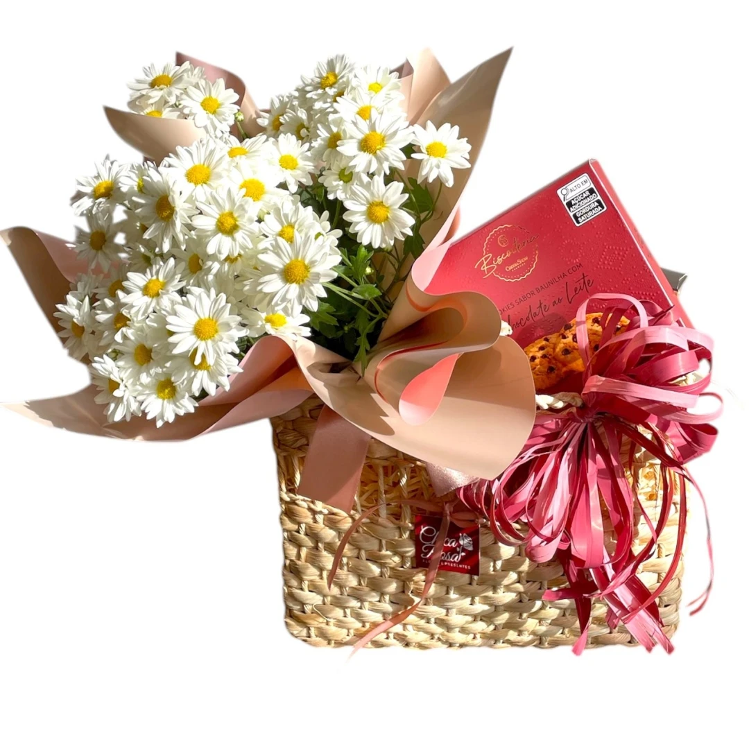 Encante quem você ama com essa linda Cesta de Margaridas com Cookies — uma combinação perfeita entre a delicadeza das flores e o sabor irresistível dos cookies.
