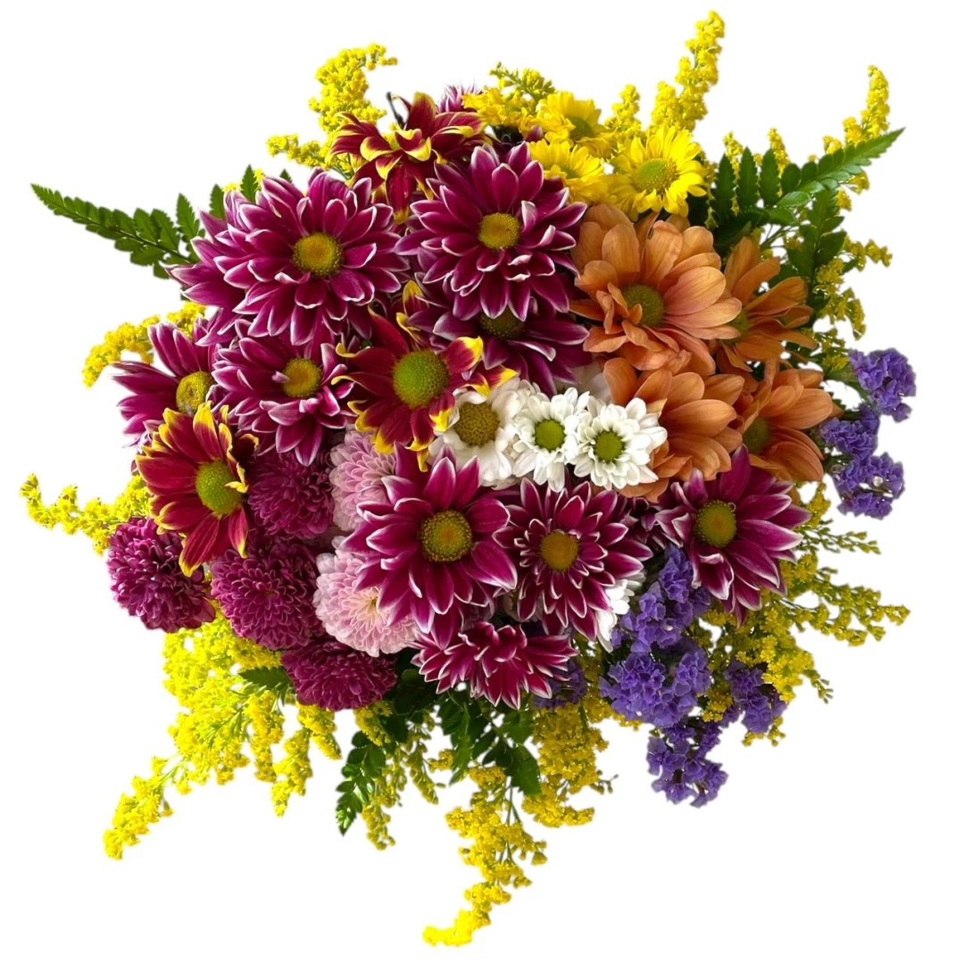 Composto por 8 hastes de margaridas coloridas, embalado e finalizado com um laço de cetim.