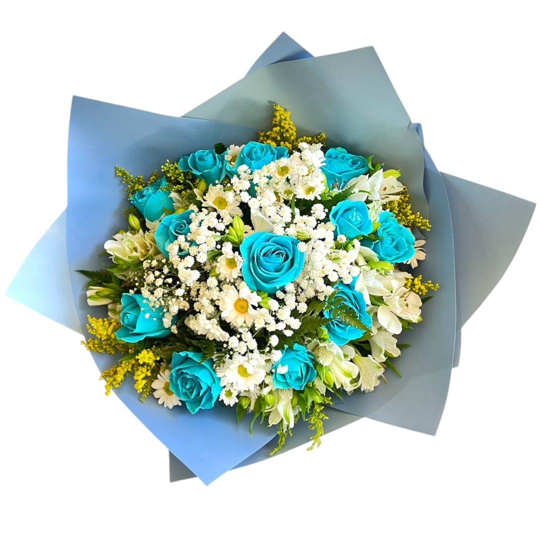 Encante com a beleza única do nosso buquê composto por 12 rosas azul tiffany, harmonizadas com delicadas flores brancas e folhagens que realçam ainda mais o contraste e a elegância do arranjo.