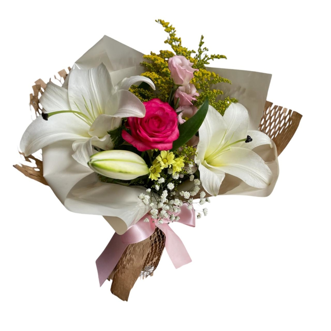 Um delicado buquê composto de lírios brancos, rosa e complementos. Perfeito para presentear em todos os momentos!