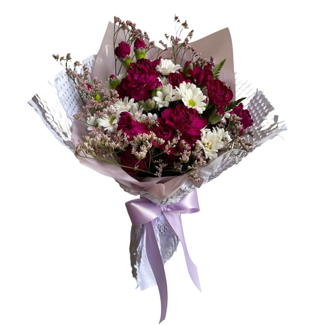 Um lindo buquê feito de cravinas e margaridinhas, para demonstrar ternura por quem se aprecia.