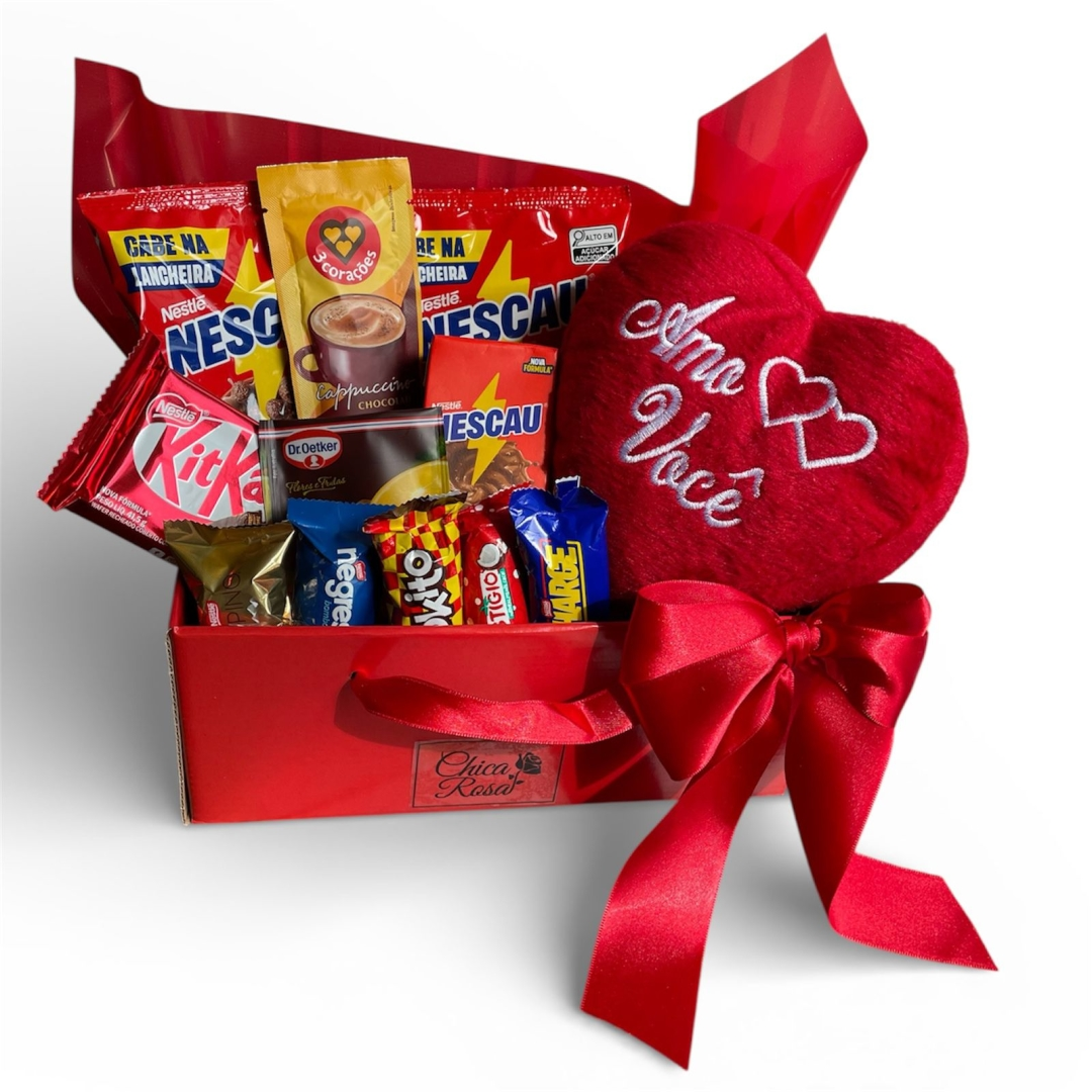 Ela acompanha deliciosos chocolates variados (como KitKat, Nescau, biscoitos recheados e outras gostosuras), cappuccino cremoso, achocolatado, dois cereais cobertos com chocolate e um lindo coração de pelúcia com a mensagem “Amo Você”, que torna o presente ainda mais apaixonante.