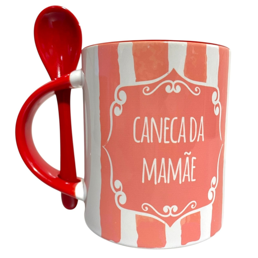Com design delicado em tons de rosa e branco, a “Caneca da Mamãe” traz um toque especial de amor e elegância. O grande diferencial fica por conta da alça com colher acoplada, prática e criativa, ideal para misturar bebidas como café, chá ou chocolate quente.