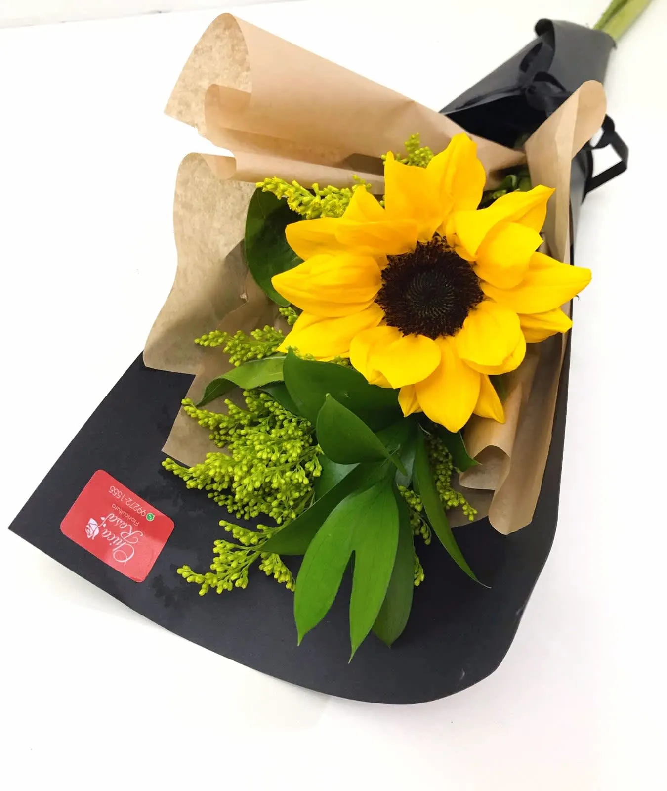 Esta composição de Girassol unitário é composta por folhagens verdes e a embalagem é cartonada, finalizando com laço de Cetim.