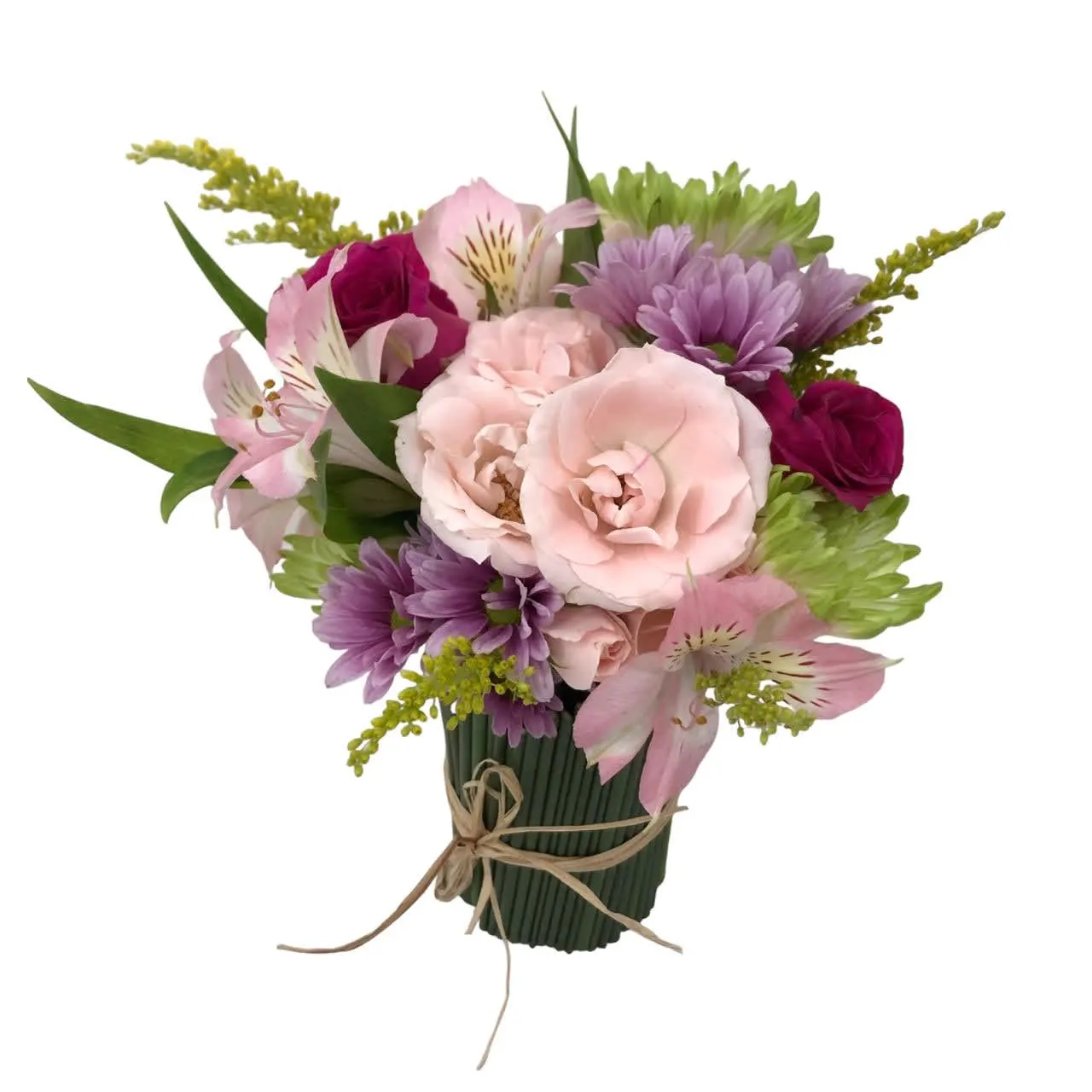 Este pequeno arranjo de flores mistas no vaso é muito versátil e adequado para presentear em diversas ocasiões.