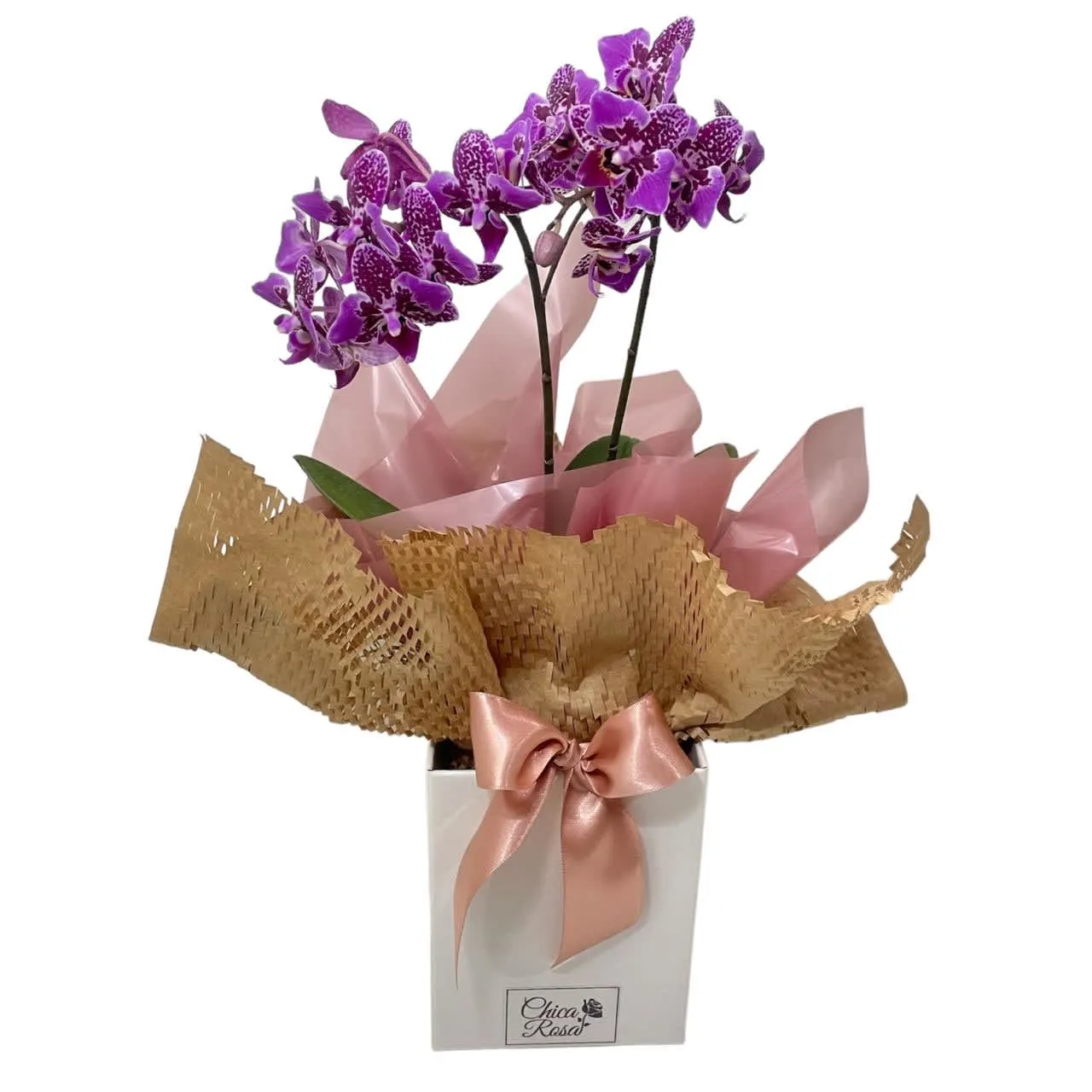 Esta orquídea Phalaenopsis pode vir nas variações de cores de rosa a lilás, de acordo com a disponibilidade, tamanho total da altura do arranjo aproximadamente 60cm midi.