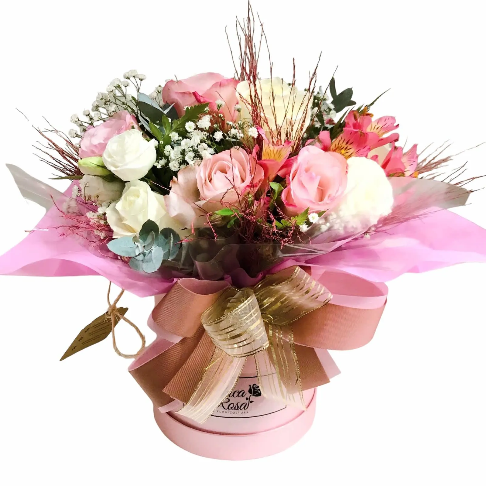 Box cartonado com tampa, 7 rosas neutras, 4 Alstroemérias, 4 Lisianthus, 3 Aspargos ou Boca de Leão, demais flores de complemento, conforme modelo apresentado, arranjo em água, finalizado com fita de Cetim