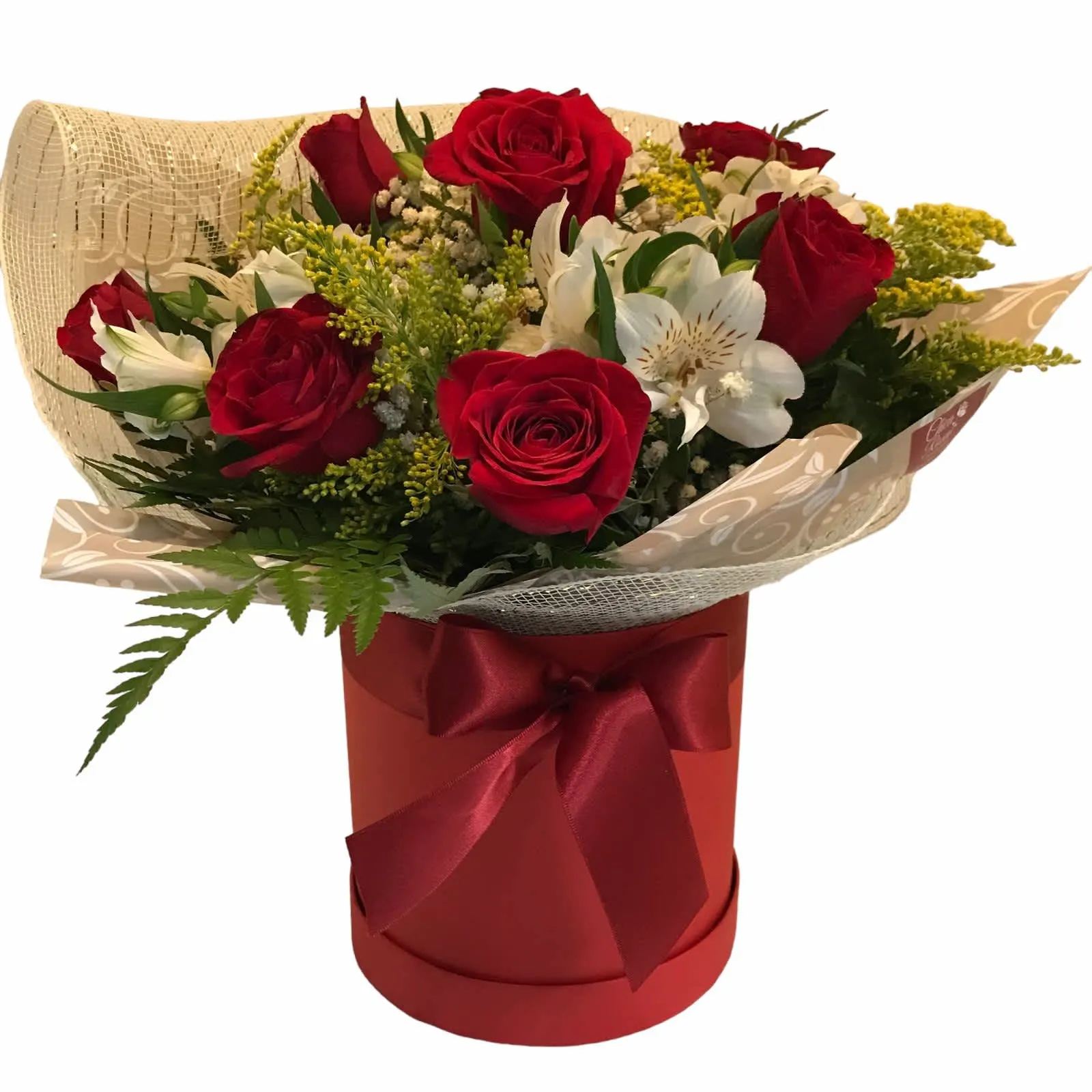Com 7 Rosas Vermelhas, 4 Alstroemérias, 5 Tangos, 3 Gipsophila e demais flores de complemento.