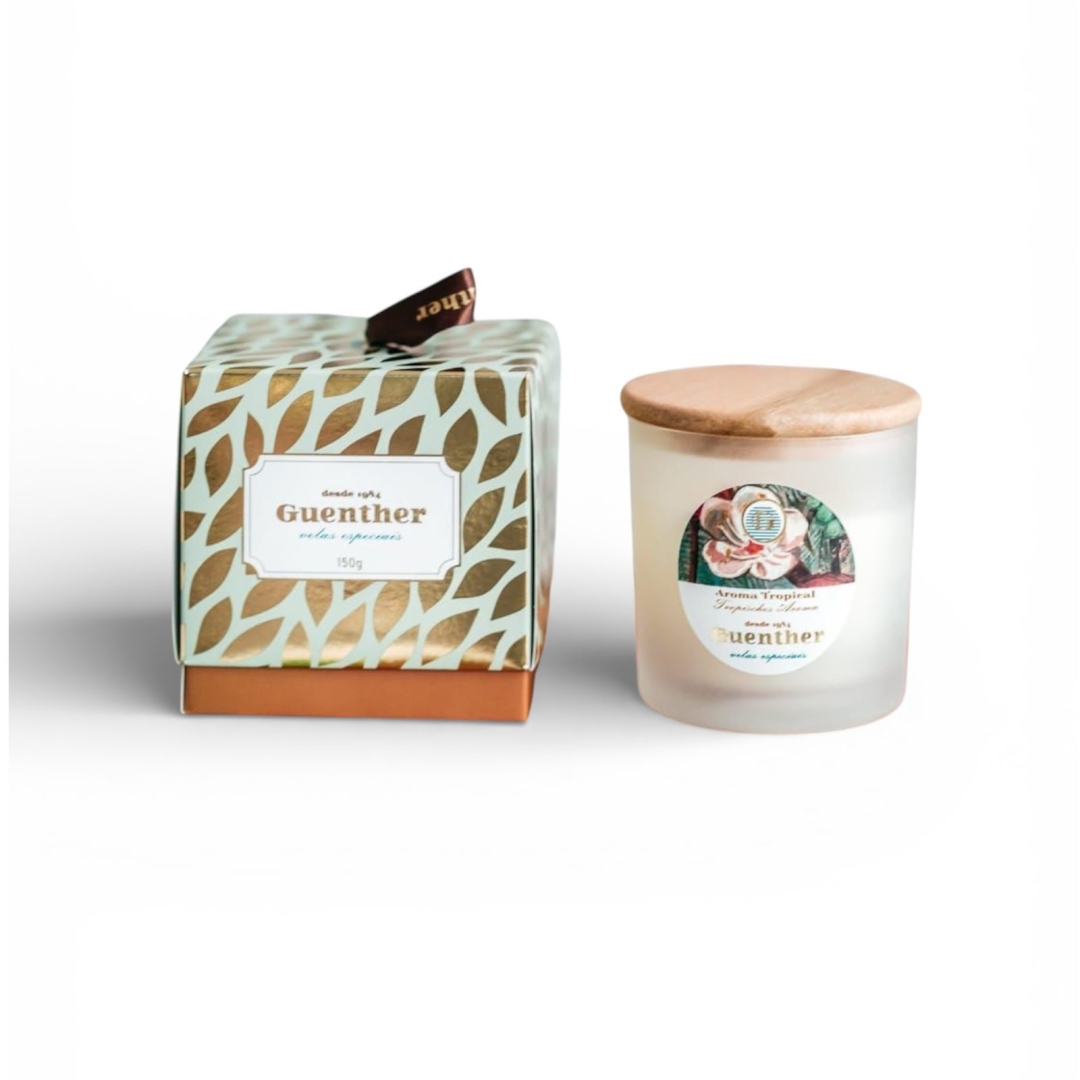 Vela muito perfumada perfumada, presente fino e delicado. Vidro fosco com tampa em madeira, 150 g Aroma: Aroma tropical