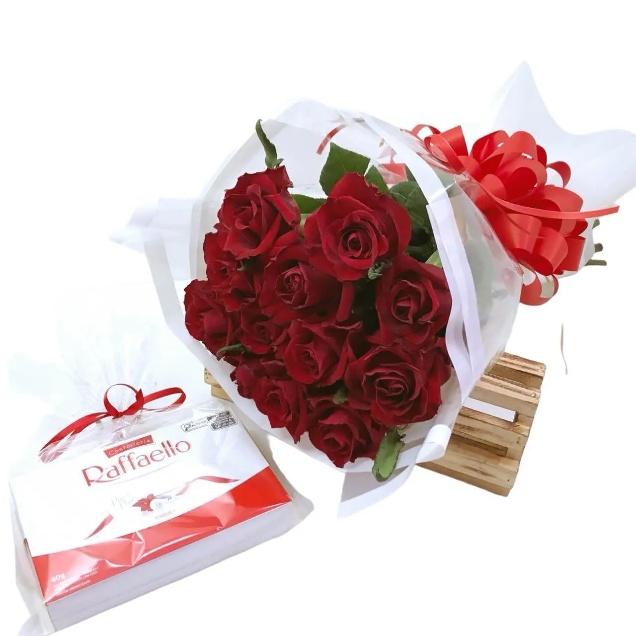 Composição de 12 rosas vermelhas e bombons Raffaello caixa 90g