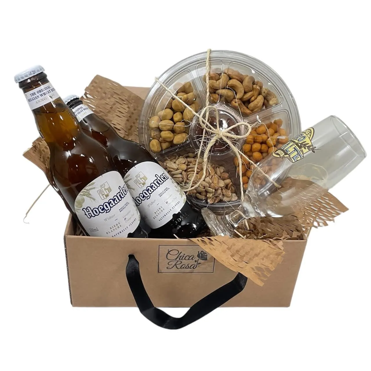 Composto por caixa cartonada, finalizada com fita de Cetim, duas Cervejas Hoegarden, uma taça de vidro para cerveja, kit com quatro variações de nuts (100g Amendoins, 100g Amendoins salgados, Amendoins crocantes e Castanha de Caju)