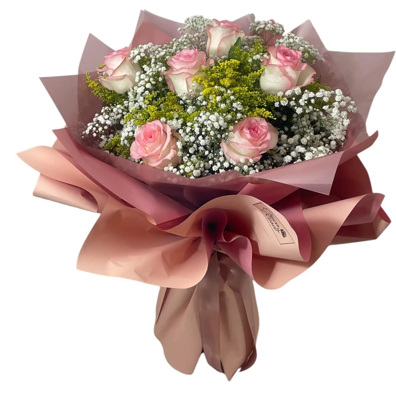 Este buquê é composto por 6 rosas na cor rosa, 6 hastes de Gipsophila, 8 hastes de Tango e folhagem verde