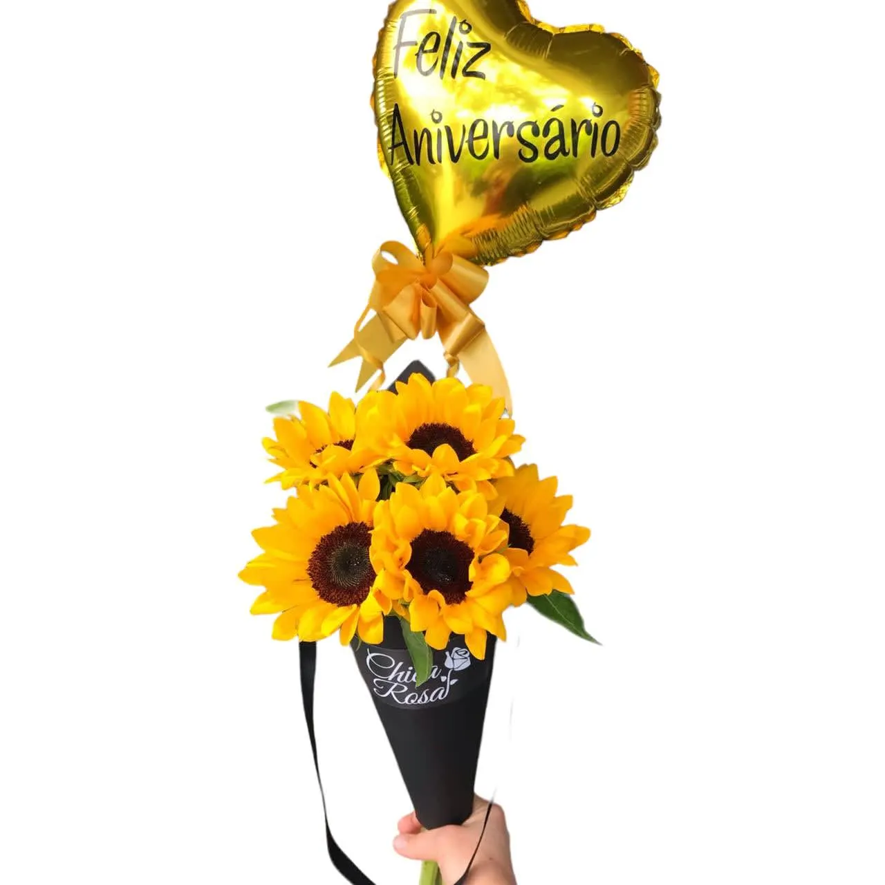 Contém 5 girassóis em uma embalagem cone, acompanha um balão metálico 22 cm com a frase Feliz aniversário